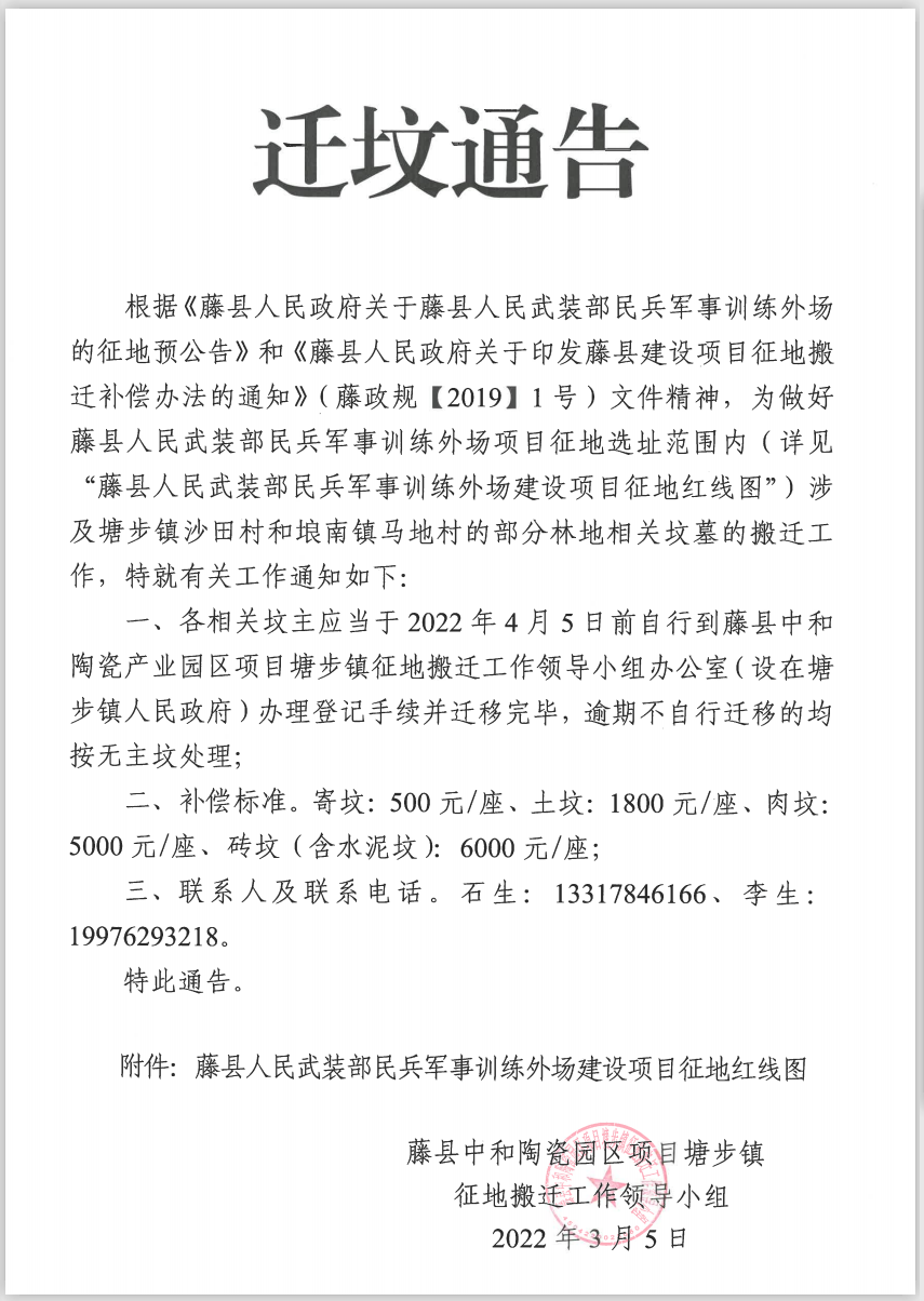 根据《藤县人民政府关于藤县人民武装部民兵军事训练外场的征地预公告》和《藤县人民政府关于印发藤县建设项目征地搬迁补偿办法的通知》(藤政规[2019] 1号)文件精神,为做好藤县人民武装部民兵军事训练外场项目征地选址范围内(详见“藤县人民武装部民兵军事训练外场建设项目征地红线图”)涉及塘步镇沙田村和娘南镇马地村的部分林地相关坟墓的搬迁工作,特就有关工作通知如下: